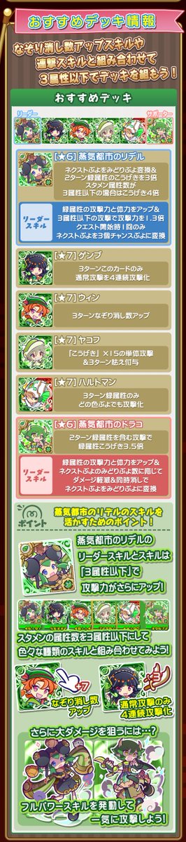 ぷよクエ 7 おすすめ- ぷよクエ(ぷよぷよクエスト)攻略班 超高難易度クエスト「蒸気と暗闇の塔」開催中! 新階層が登場しているので、この機会にクリアしてしまいましょう! 新階層「タイプを1種類で挑戦」登場! 蒸気と暗闇の塔とは? ぷよクエ(ぷよぷよクエスト)のおすすめデッキ編成を一覧で掲載しています。 キャラクター毎のデッキ編成を紹介しているのでぷよクエにおける、蒸気都市のウィッチ(星7)のおすすめデッキ(パーティ)編成を紹介しています。 蒸気都市のウィッチ(星7)をリーダーとして運用したい方は、ぜひ参考にしてください。 7あんどうりんご追加ぷよクエで最強倍率を持つ